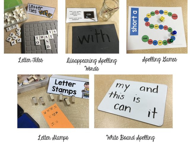 So my tables of students remain static- everyone stays at their own spot while we practice simple word work centers like Disappearing Spelling Words, Letter Tiles, Dough Words, White Board Spelling, Letter Stamps, and Spelling Games.